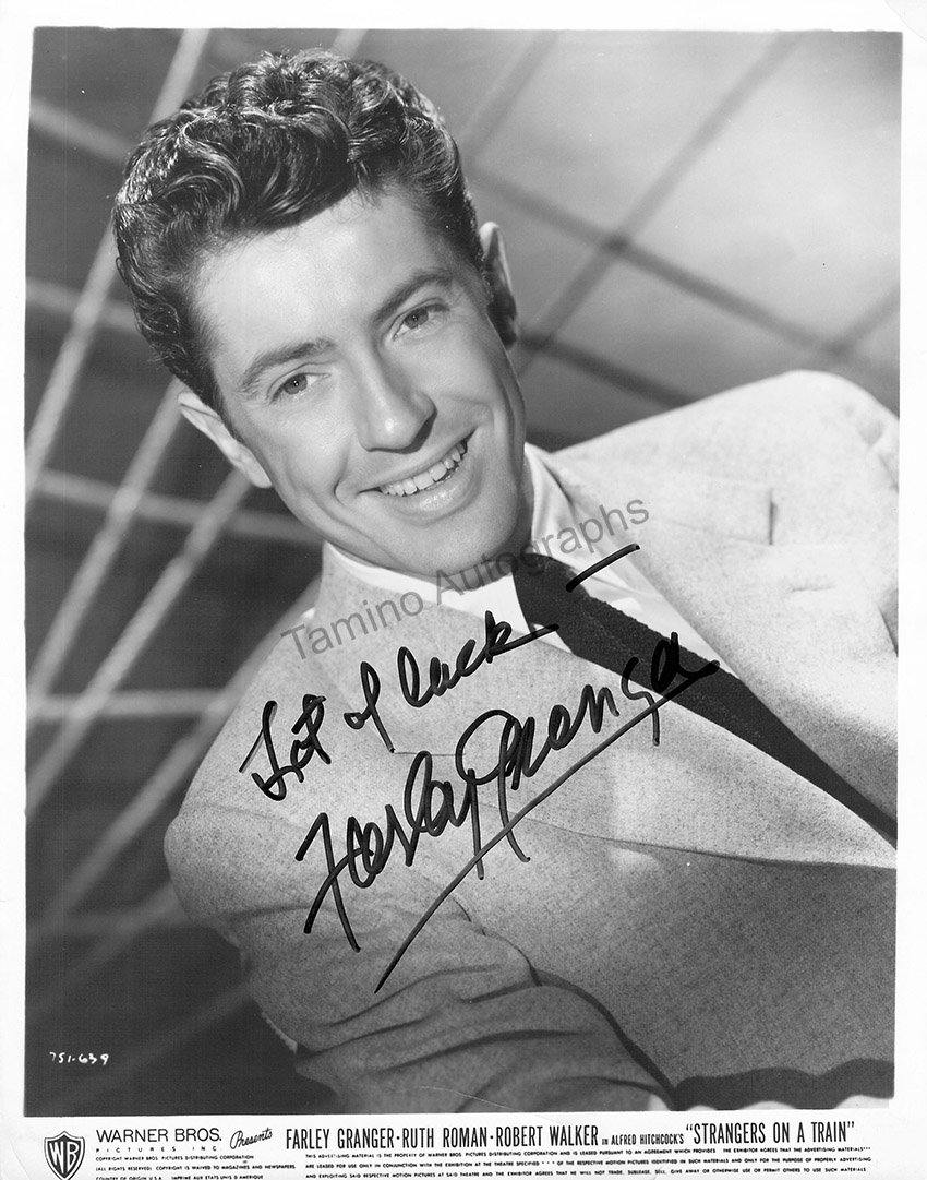 Promo photograph of Hitchcock's film "Strangers on a Train" (1951), signed by Granger with a short sentiment.  Size is 7.9 x 10.1 inches, crease over the lower border, in very good condition.