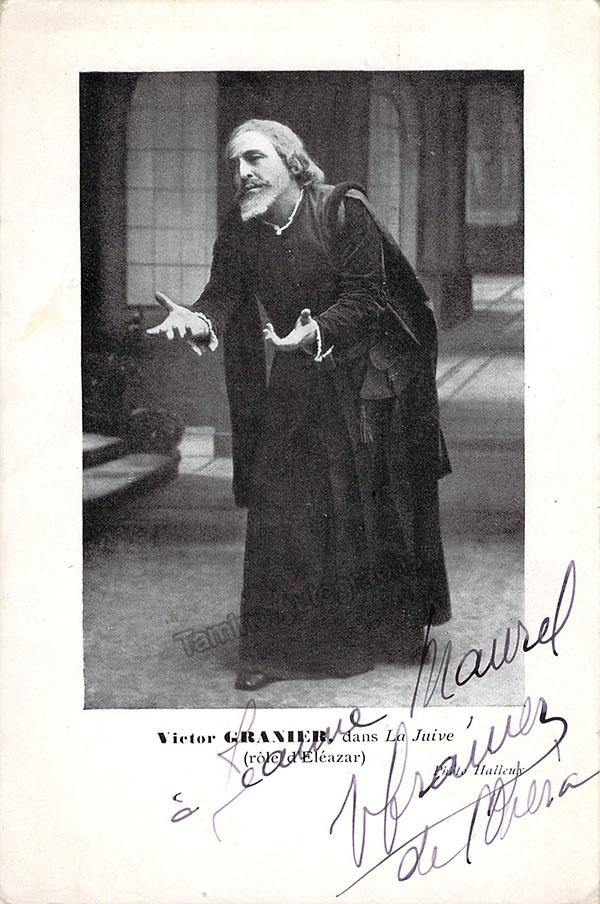 Signed photo of the French tenor, shown as Eleazar in Meyerbeer's La Juive, inscribed. Photo by Halleux, Antwerp. Size is 3.75 x 5.75 inches, some frayed edges and wear on verso but in otherwise good condition.