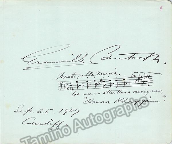 Autograph music quote signed and dated by him in Cardiff in 1907. Quote belongs to his choral epic "Omar Khayyam" for solo voices, chorus and orchestra - The second part (out of a total of 3) of this large vocal work was premiered precisely in Cardiff in 1907. Quote is in a loose page from an autograph album, size is 6 x 5 inches, in excellent condition