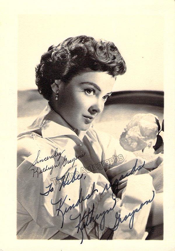 American actress and coloratura soprano (1922-2010) who started her career as an opera singer but turned into movies, active in films between 1941 and 1998.  Signed photograph shown probably in a film, inscribed, with a small printed signature on the photo plus her actual signature in blue ink.  Size is 3.5 x 5.5 inches, in excellent condition.