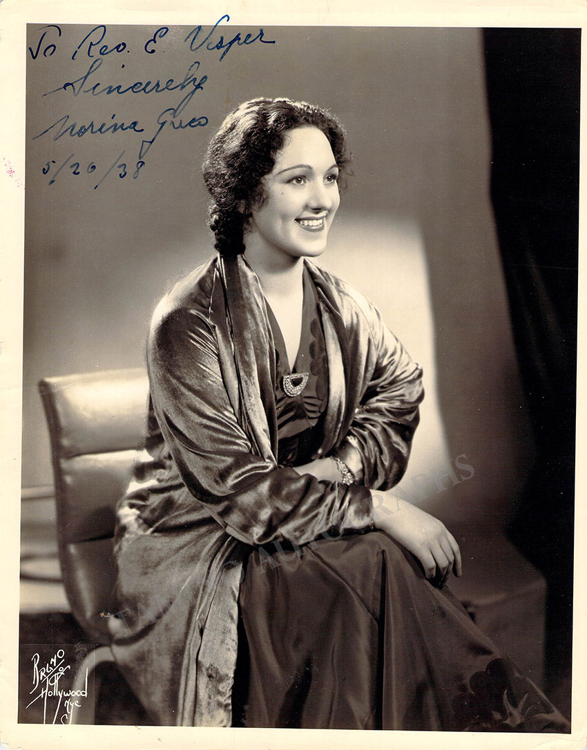Italian soprano (1915-2007), signed photograph, shown as herself or possibly in role. Inscribed and dated in 1938. Printed signature on front and stamped on verso by photographer Bruno of Hollywood and New York City. Size is 8 x 10 inches, small creases on bottom left and right, otherwise in excellent condition.