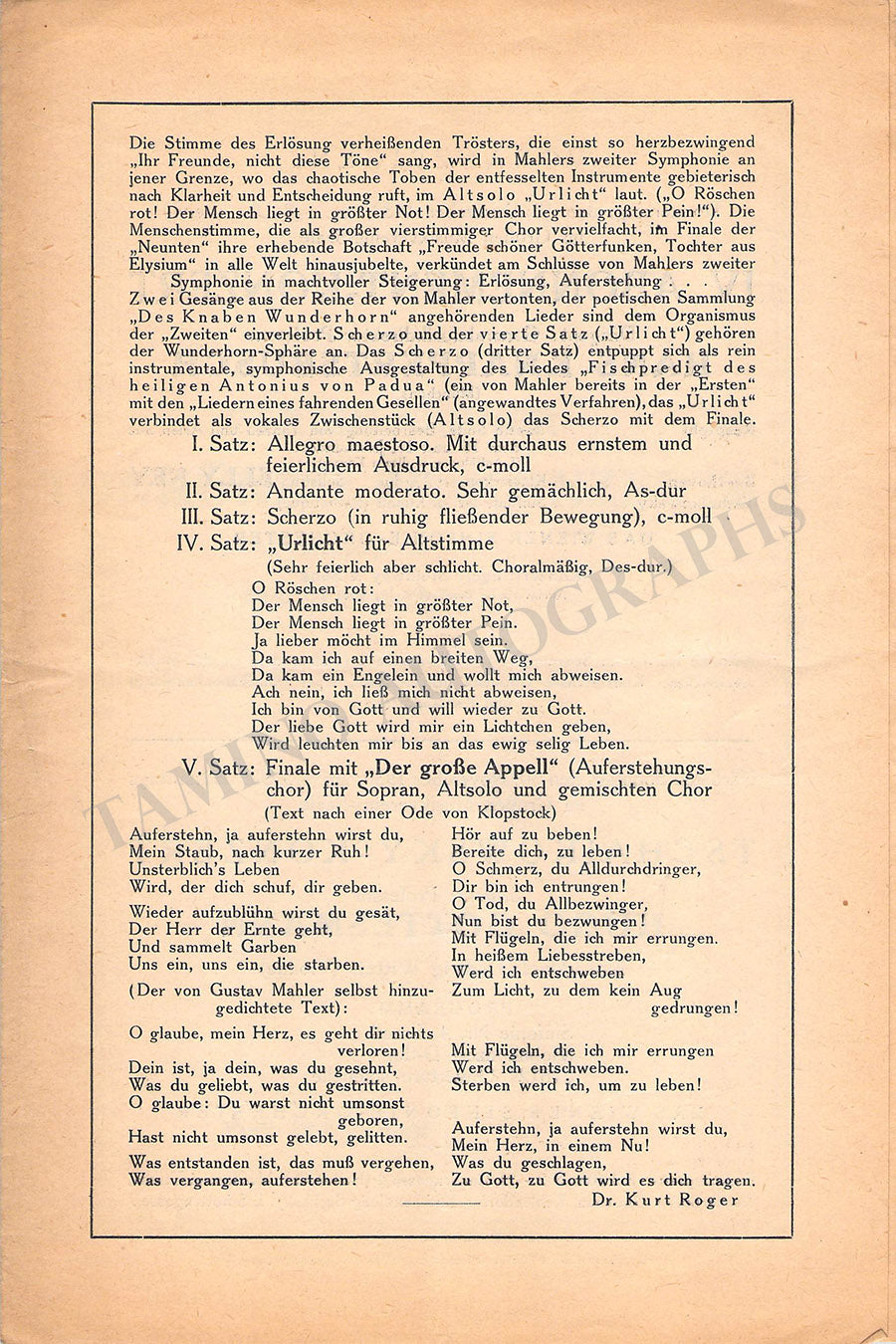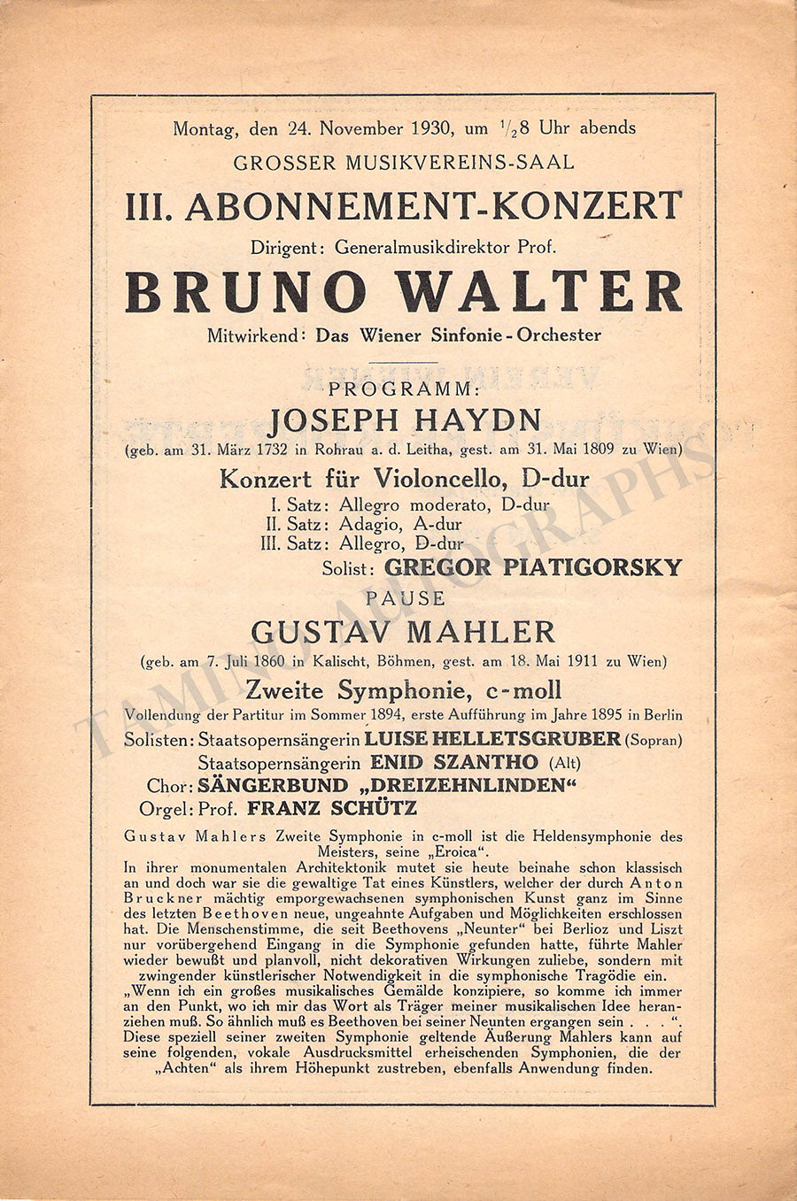 Program for a performance of Haydn's cello concerto by the American cellist and Mahler's 2n Symphony "Resurrection" both under the baton of the celebrated German-born conductor Bruno Walter in Vienna, on November 24, 1930.