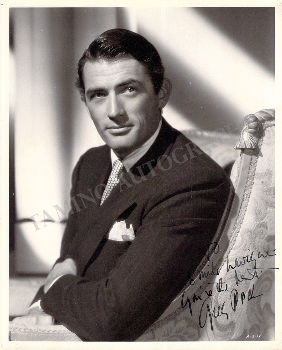 Fine black-and-white movie-still photograph signed and inscribed by him with a short sentiment, shown young. Size is 8 x 9.9 inches, vertical crease across, otherwise in very good condition.