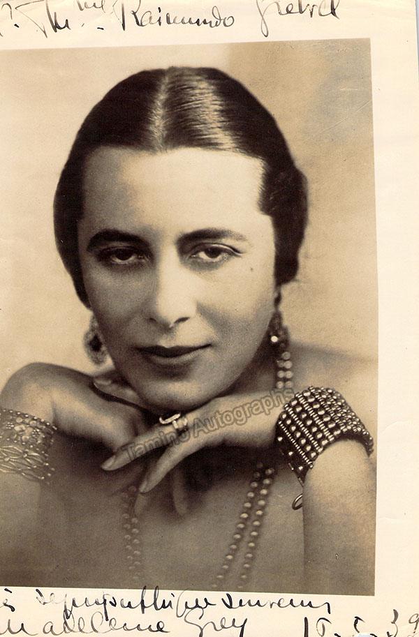 French soprano (1896-1979). Large signed photo, shown as herself, dated in 1939, inscribed to Raimundo Grevel.  Size is 6.5 x 9.5 inches, small hole at bottom right of photo and some bumps on edges but otherwise in good condition.