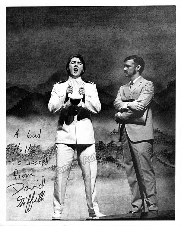 American tenor (b. 1939), signed photograph, shown as Pinkerton in Puccini's Madama Butterfly with Matthew Murray as Sharpless, inscribed. Stamped on verso by photographer Jane Rady. Size is 8 x 10 inches, in excellent condition.