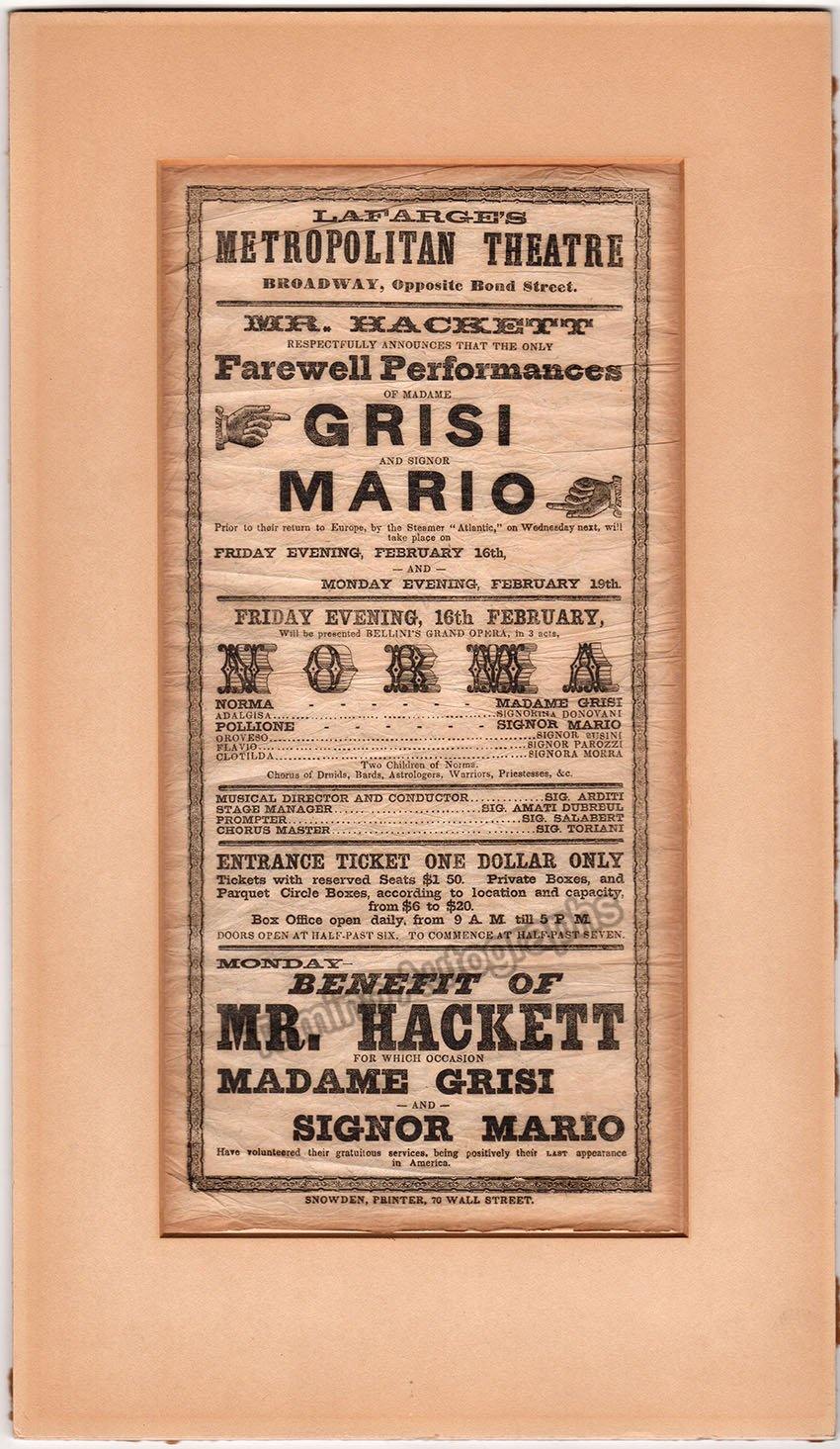Playbill advertisement for two performances of Bellini's Norma at the Metropolitan Theater, New York, on February 16th and 19th, (ca. the 1850s), mounted on hard cardboard (removable).  Total size is 8.25 x 14.25 inches, playbill size is 5.25 x 10.7 inches (visible window size), rust on edges, very fragile brittle paper, in overall very good condition.
