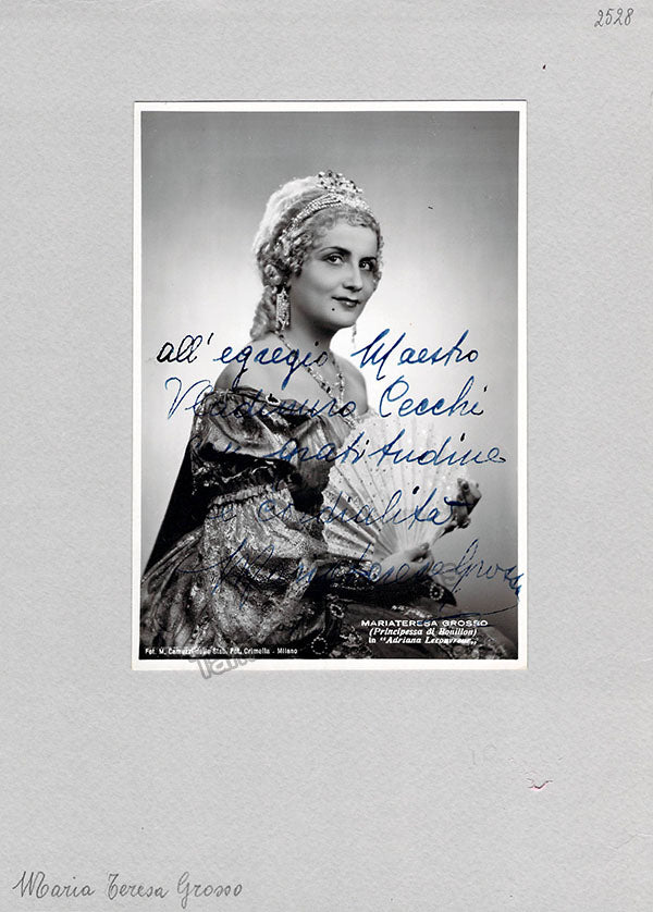Italian mezzo-soprano, signed photograph, shown as the Princess di Bouillon in Cilea's Adriana Lecouvreur at La Scala Milan, inscribed. Photo by M. Camuzzi, Milan. 4 x 5.75 inch photo mounted onto soft cardboard, total item is 6.75 x 9.5 inches, in excellent condition.