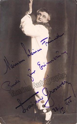 Signed photo postcard of the Romanian tenor (1895-1927), shown as Canio in Leoncavallo's Pagliacci, dated in 1926. Inscribed. Size 3.25 x 5.5 inches.