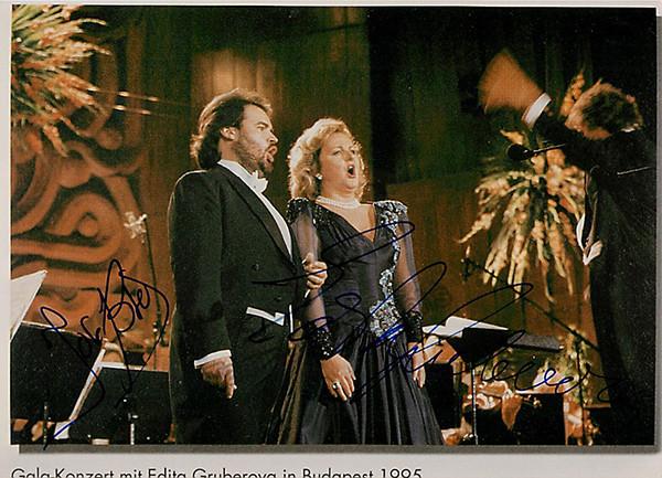 Slovak soprano (b. 1946) and Spanish tenor (b.1965), double signed photo, shown in a galla concert in Budapest, in 1995. Size is 7 x 5 inches, in excellent condition.