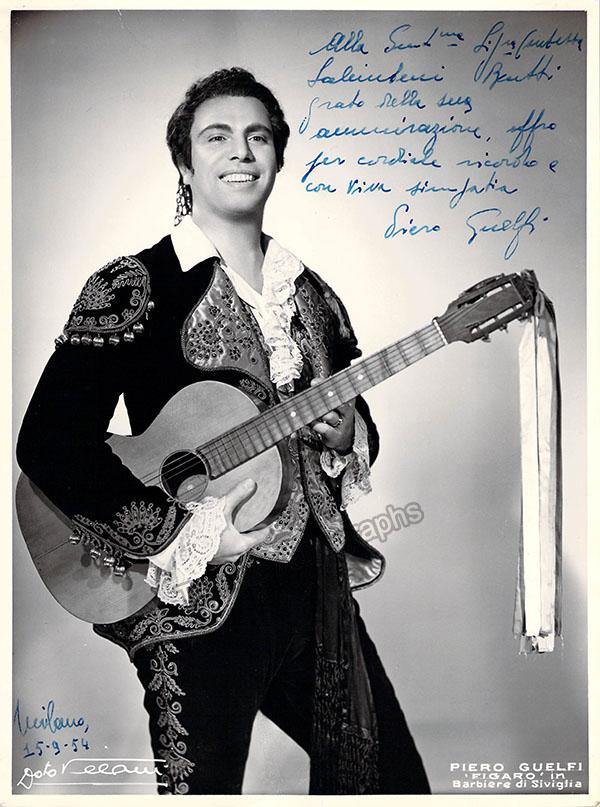 Italian baritone (1914-1989).  Signed photograph, shown in the title role of Rossini's Il Barbiere di Siviglia, inscribed and dated in Milan in 1954.  Signed on the front and stamped on verso by photographer Villani, Bologna. Size is 7 x 9.5 inches, in excellent condition.