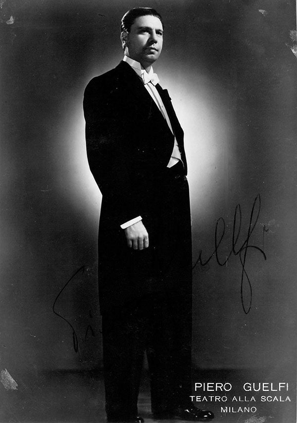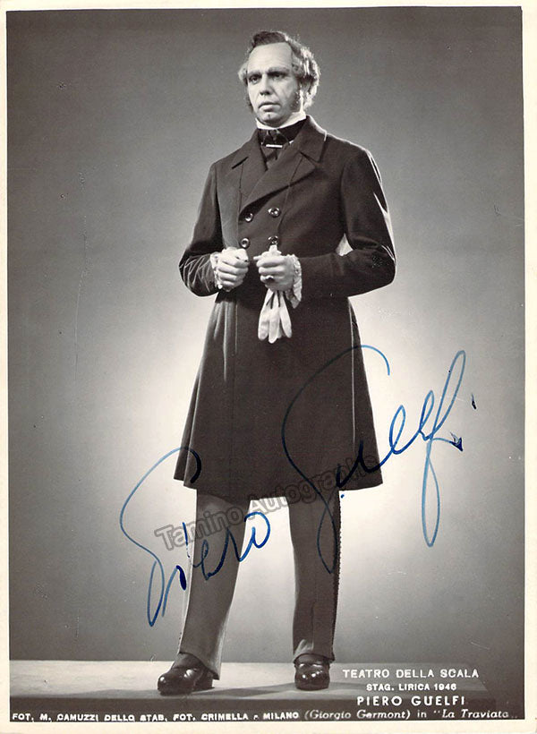 Signed photograph, shown as Germont in Verdi's La Traviata, dated in Milan in 1946. Signed on front by photographer M. Camuzzi, Milan. Size is 4 x 5.5 inches, in excellent condition.