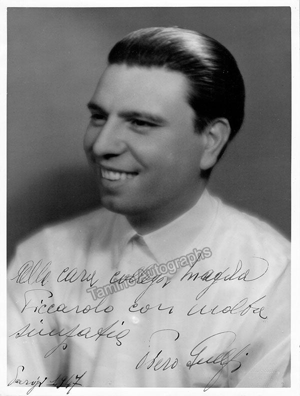 Signed photo, shown as himself, inscribed, dated in 1947. Blind stamped on front and stamped on verso by photographer Montacchini Arduini, Teatro Regio, Parma. Size is 7 x 9.5 inches, in excellent condition.
