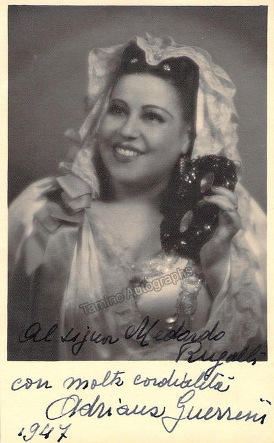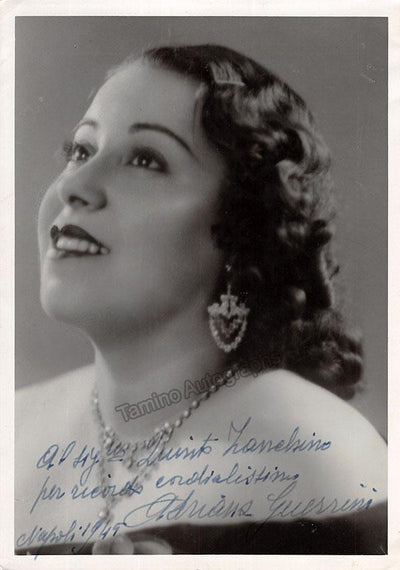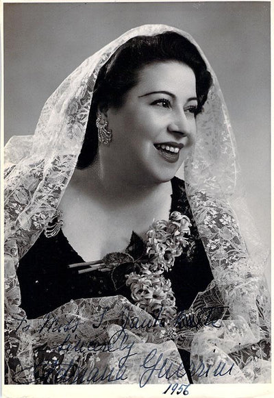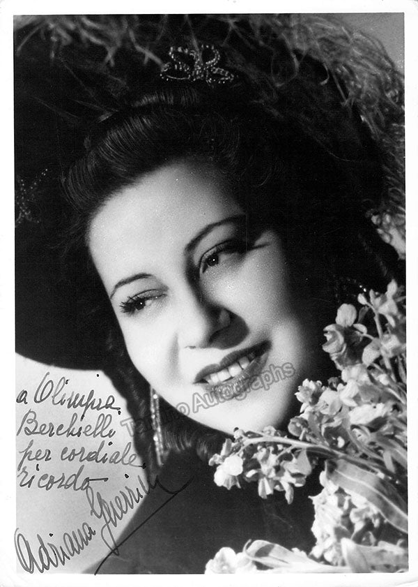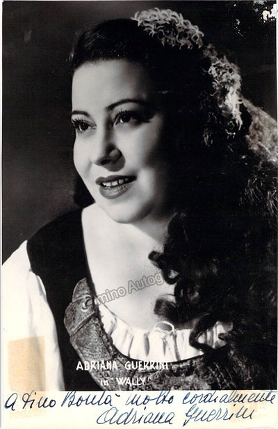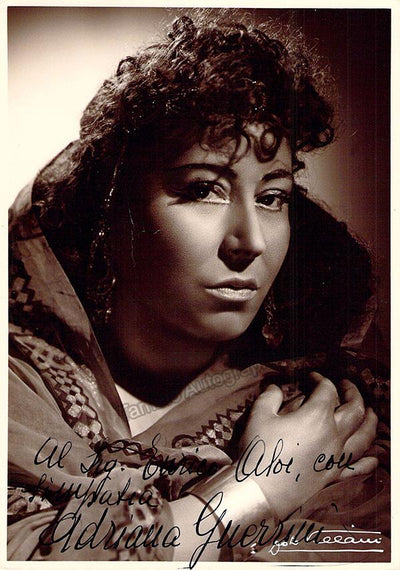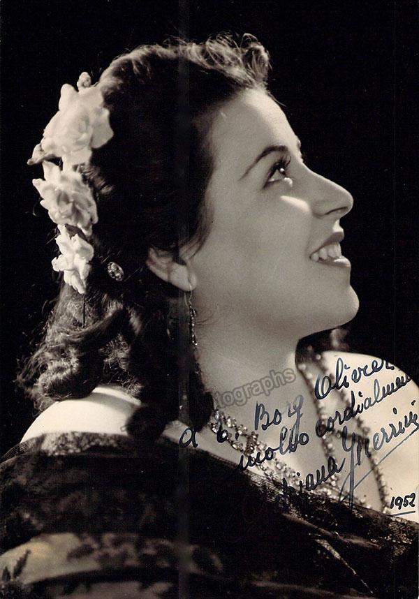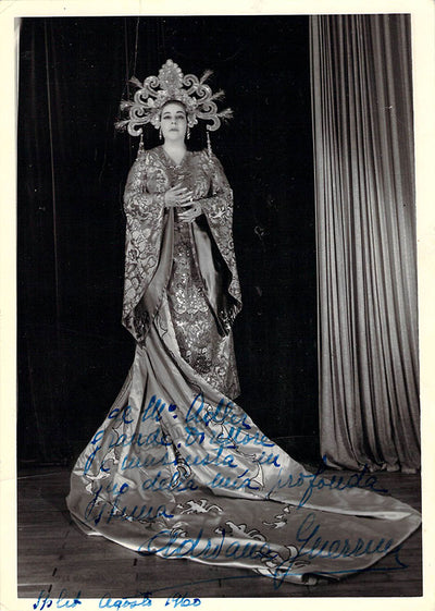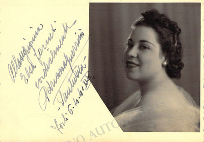 Signed photograph, shown in the title role of Puccini's Turandot, inscribed with sentiment, dated in 1960. Stamped on verso by photographer Guidotti, Rome. Size is 5 x 7 inches, small creases and bends, otherwise in very good condition.
