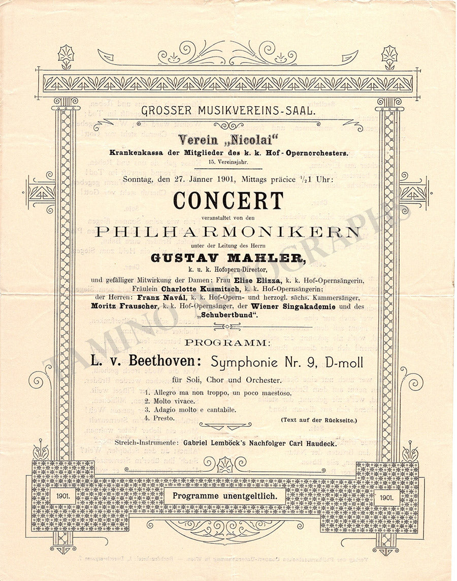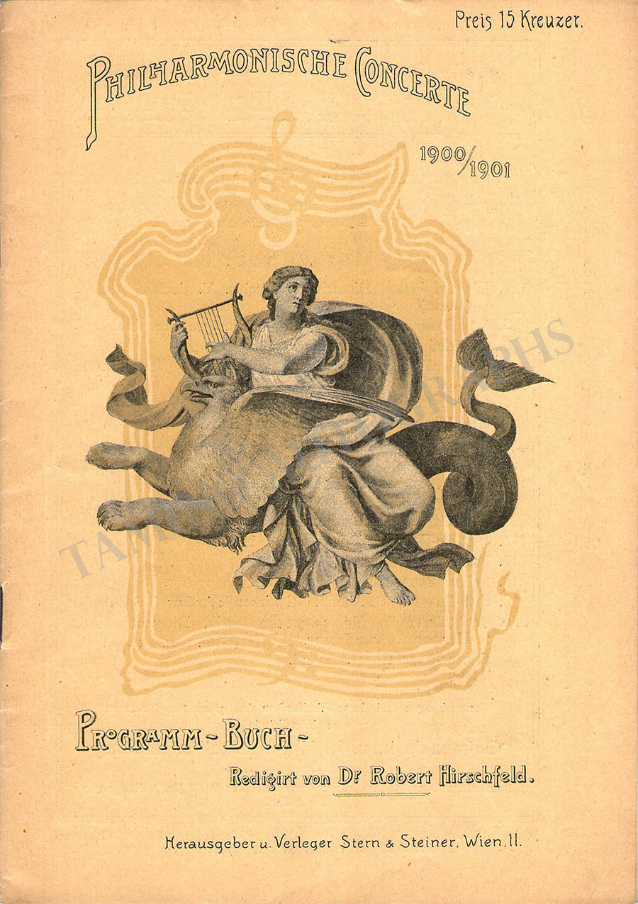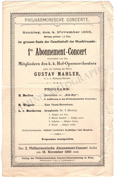 Program for a performance of music by Berlioz, Wagner, and Beethoven, in Vienna, on November 4, 1900. Size is 5.8 x 9.25 inches, small loss of paper over the upper-right corner, in very good condition.