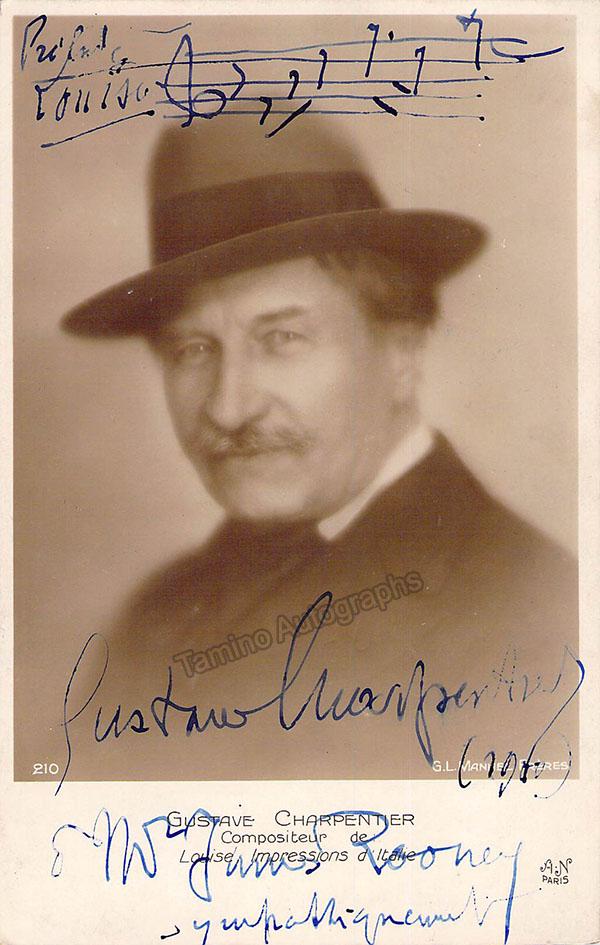 French composer (1860-1956), author of famous verismo opera Louise (premiered in 1900), other symphonies and songs. Student of Jules Massenet. Signed photo postcard, with a short music quote form Louise, his most famous work, inscribed and dated. Size is 3.5 x 5.4 inches, in excellent condition.