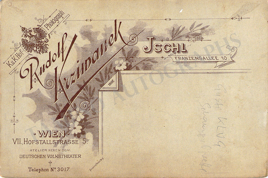 Nice vintage cabinet photograph by Rudolf Krziwanek (Vienna), signed and inscribed by the soprano with a long sentiment.  Size is 4.25 x 6.4 inches, in very good condition.