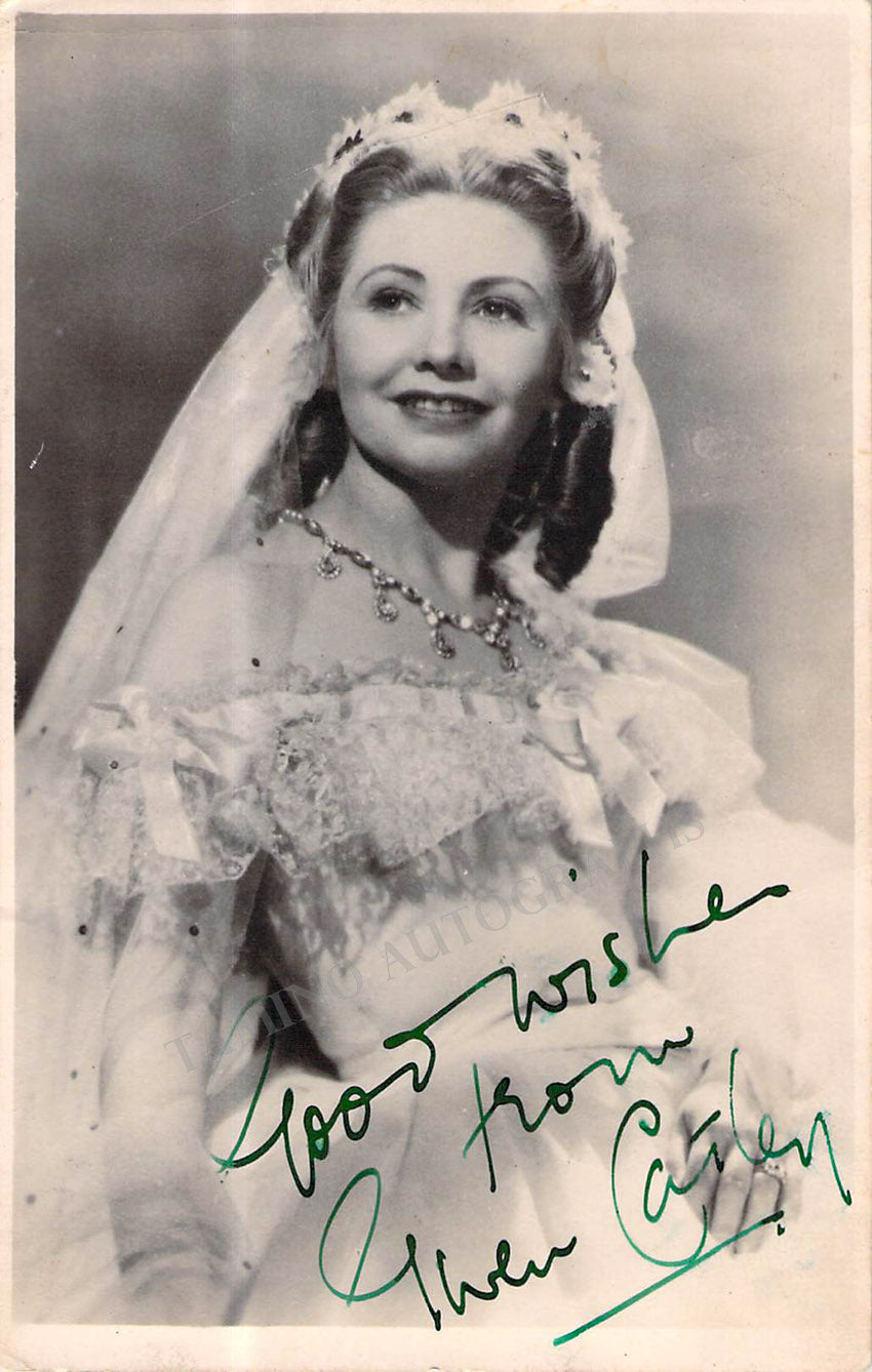 Black-and-white photo postcard signed by her with a short sentiment, here shown probably in role. Size is 3.4 x 5.4 inches, in excellent condition.