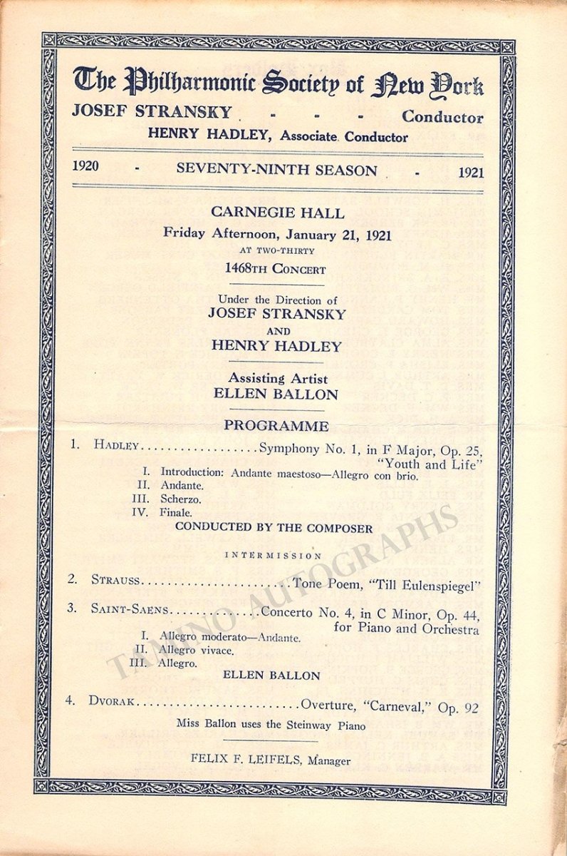 Program for a concert at Carnegie Hall, Jan 21st, 1921, with American composer Henry Hadley (1871-1937) conducting his own music (Symphony Nr 1, in F Major "Youth and Life"). Size is 6 x 9 inches, 8 pages, in very good condition.