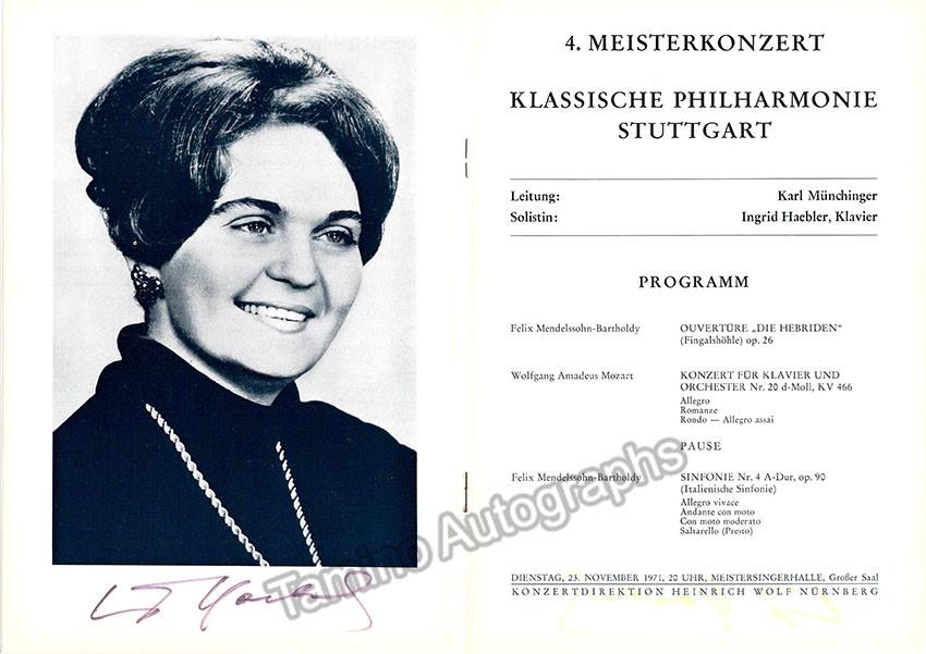 Signed on the photo page - Concert with the Klassische Philharmonie, Stuttgart. Nurnberg November 23rd, 1971, performing music by Mendelssohn, Mozart Piano Concerto Nr 20, Mendelssohn Symphony Nr 4. Size is 21 x 15 cm, in mint condition.