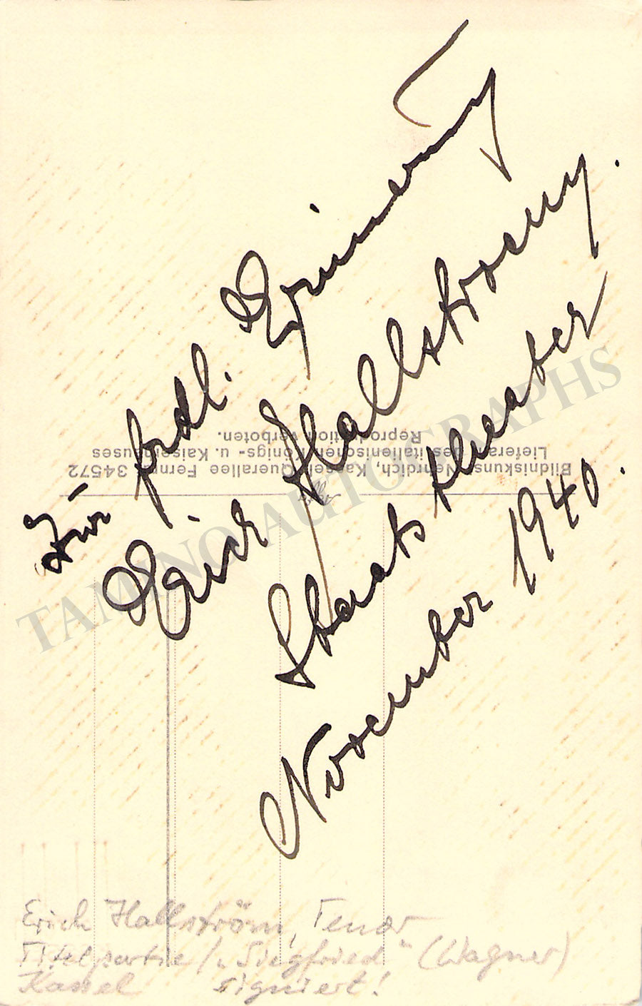 Norwegian tenor (1893-1946), signed postcard photograph, shown as Siegfried in Wagner's Ring Cycle, signed and inscribed on verso, and dated in 1940. Stamped on verso by photographer. Size is 3.5 x 5.5 inches, in very good condition.