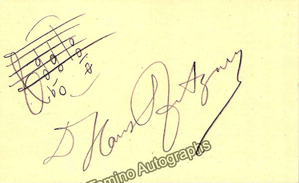 Card signed by him in pencil with 2 bars of music from the opening of his opera "Palestrina".  Size is 5.7 x 3.4 inches, minor stains on verso, in excellent condition.