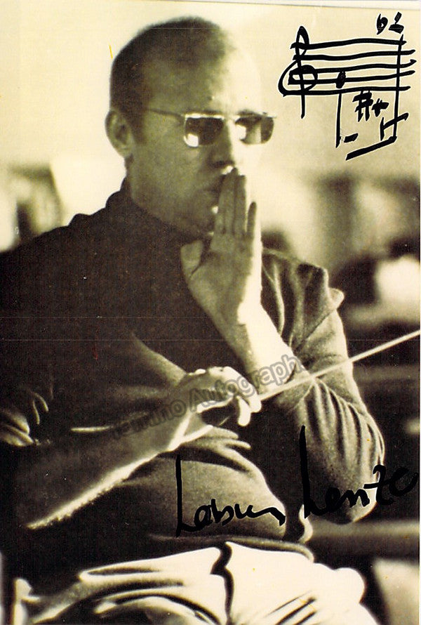 German composer (1926-2012), created a large output of great quality and in a very varied style, including 10 symphonies, many operas, orchestral, vocal and stage works, concertos, ballets and chamber music. Signed photo, inscribed with a short music quote, dated on verso in 1988. Size is 3.5 x 5 inches, in excellent condition.
