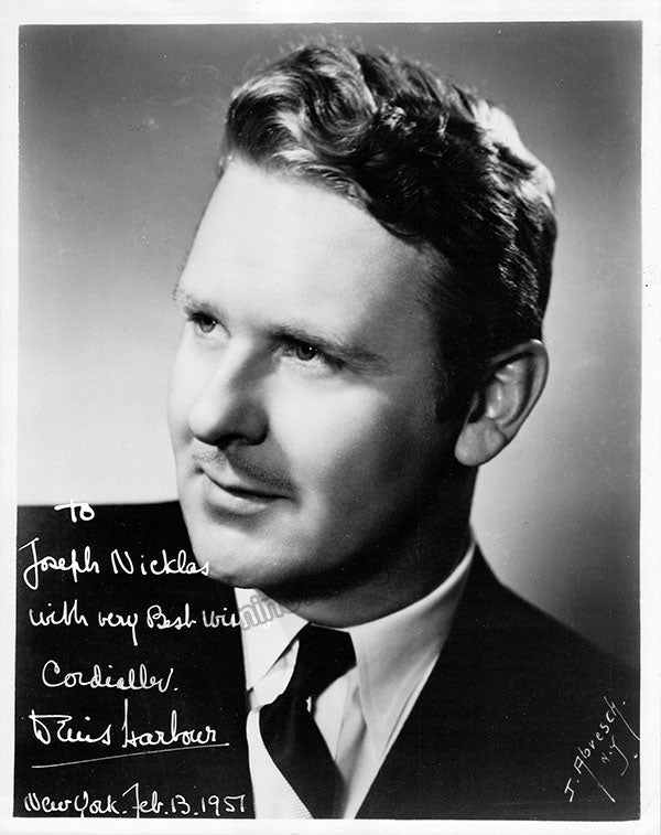 Canadian bass and later CBC radio producer (1917-2009), signed photograph, shown as himself, inscribed in New York, dated in 1957. Bold handwriting and signature. Printed signature on front of photographer J. Abresch, New York. Size is 8 x 10 inches, small crease on bottom right and mounting tape traces on verso, otherwise in excellent condition.