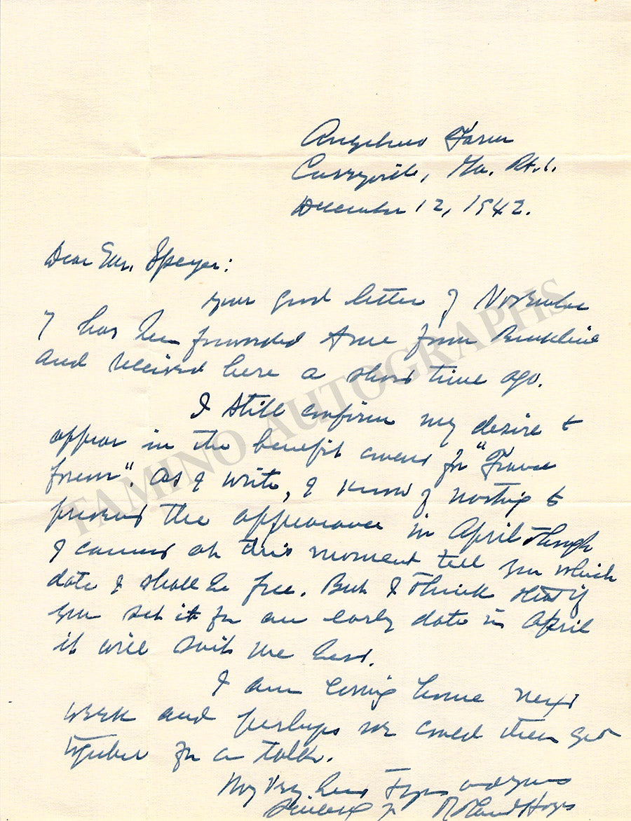 American tenor (1887-1977), autograph letter signed, 1 page in English, dated in 1942. Size is 6 x 8 inches, small creases and folds, otherwise in very good condition.