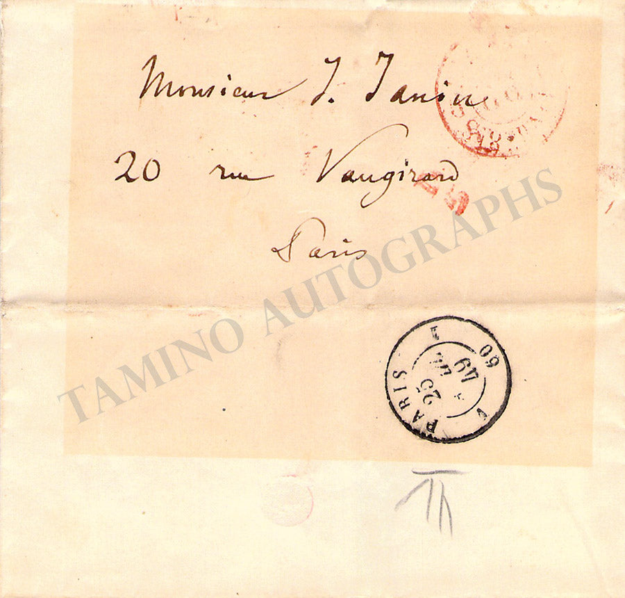 Autograph note in French (sold with translation) signed by the composer (no date mentioned), sent to his friend the music critic and writer Jules Janin (1804-1874). Size is 5.25 x 8.1 inches, mat burn marks, folds, in very good condition.