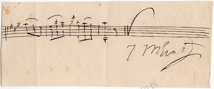 Autograph music quote with 4 bars from an unknown piece, signed by him. Size is 8.25 x 3.4 inches, probably a clip cut from an album page, left border is a bit irregular, 2 folds, minor stains, in overall very good condition.