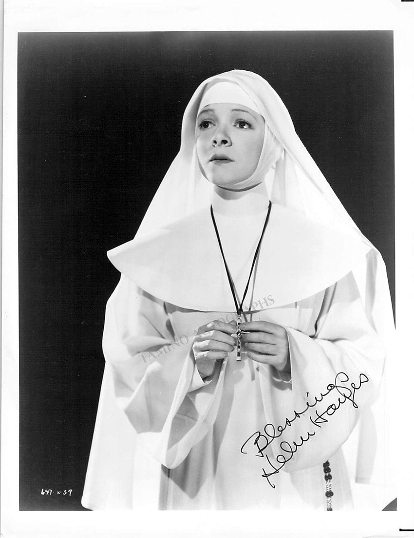 Black-and-white movie-still photograph signed by her shown in costumes as a nun. Size is 8 x 10.5 inches, in excellent condition.