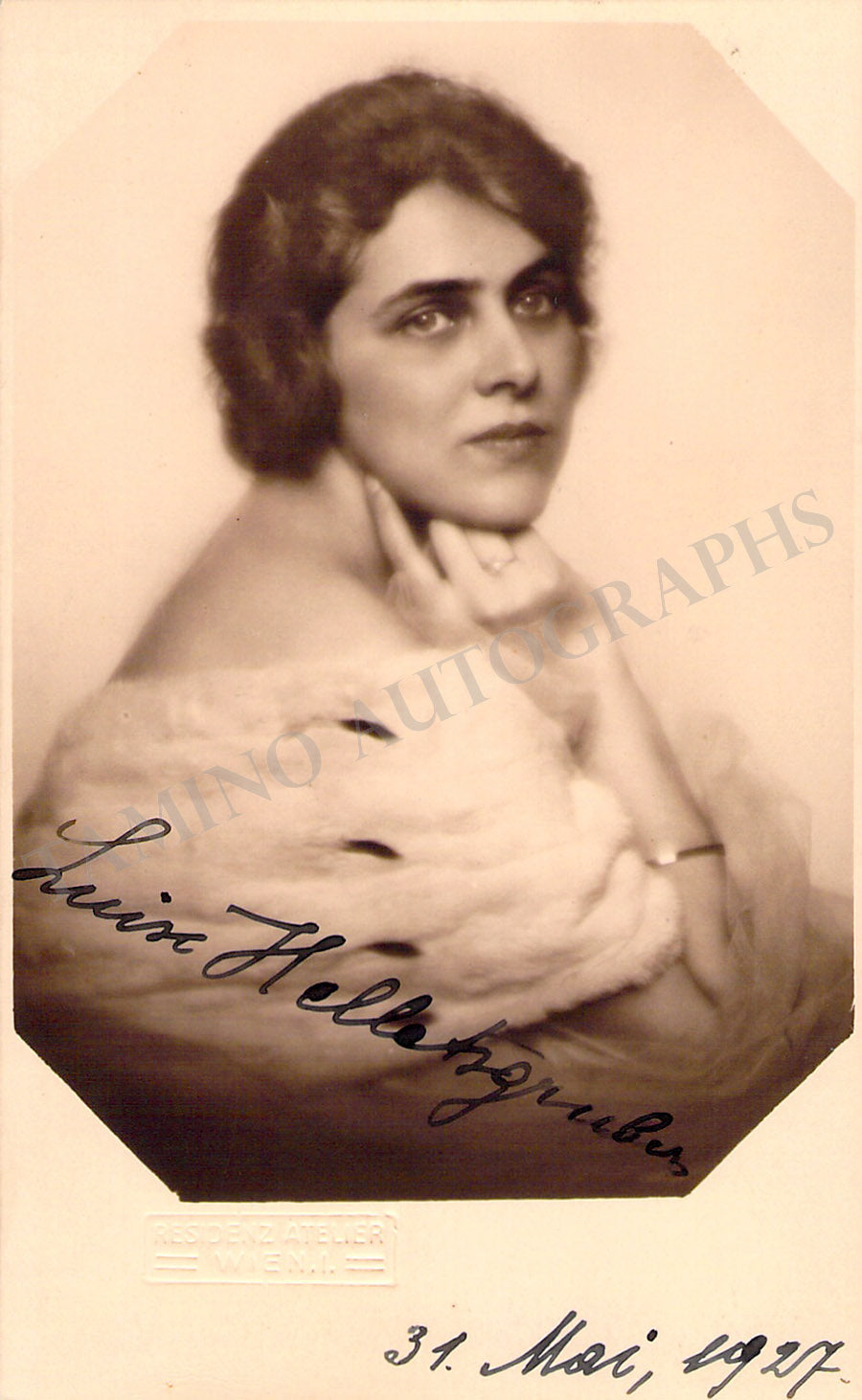 Austrian soprano (1901-1967), signed postcard photograph, shown as herself, dated in 1927. Blind stamped on front by Residenz photo studio, Vienna. Size is 3.25 x 5.25 inches, in excellent condition.