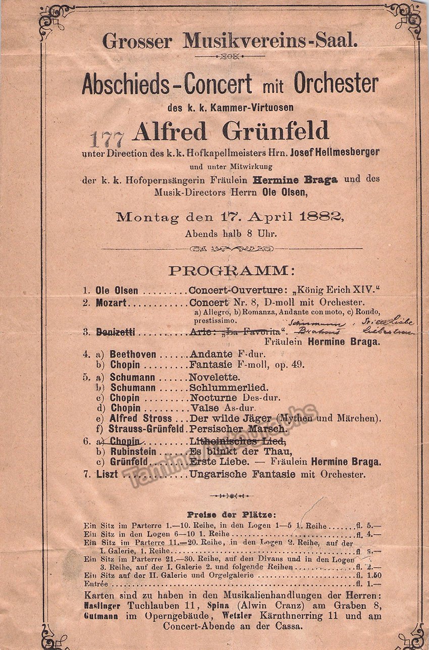 Program for a concert with the Vienna Philharmonic in 1882 with Josef Hellmesberger and Ole Olsen conducting. Grosser Musikvereinssaal, April 17th, 1882. Alfred Grünfeld, piano and Hermine Braga. One page, 9 x 6 inches, some mounting traces on verso and repaired cracks, very good condition.