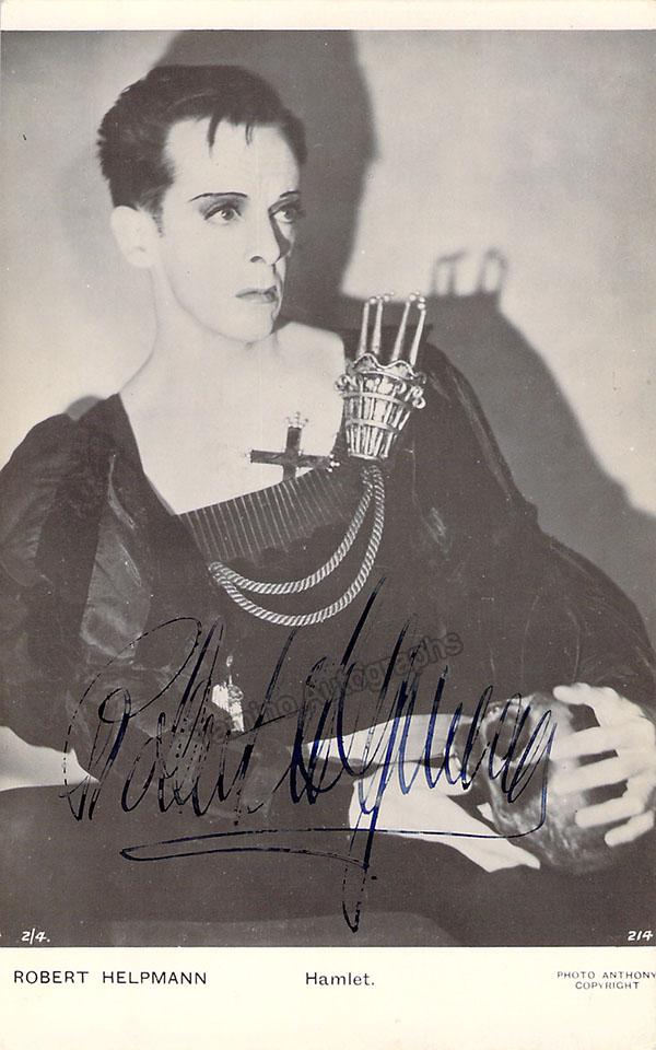 Australian dancer, actor, theater director and choreographer (1909-1986), signed photo, shown as Hamlet, one of the ballet's he himself produced. Photo by Gordon Anthony. Size is 3.5 x 5.5 inches, in very good condition.