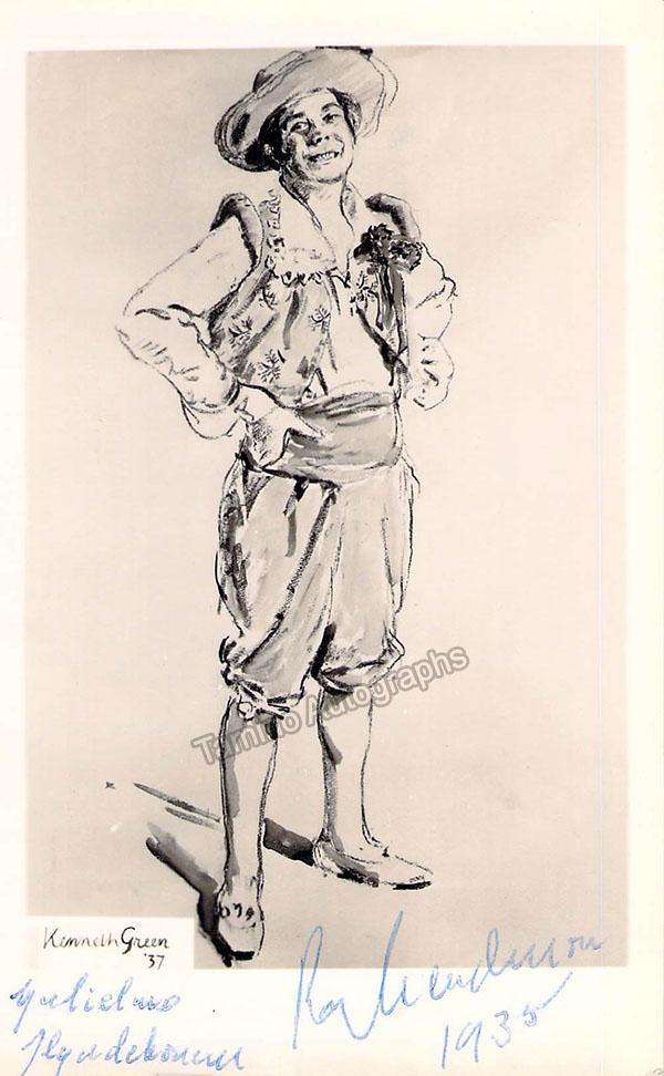 Scottish-born English baritone and voice teacher (1899-2000), a leading performer at Convent Garden and Glyndebourne in the 1920s, 1930s and 1940s, particularly known for Mozart roles, later the teacher of Kathleen Ferrier among other noteworthy singers. Signed postcard with a photographic etching, showing him in the role of Massetto in Mozart's Don Giovani, dated at the Glyndebourne festival in 1935.  This drawing is by Kenneth Green, Glyndebourne Opera. Size is 3.5 x 5.5 inches, in excellent condition.