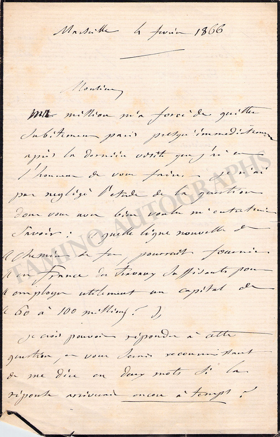 Autograph letter in French (untranslated) signed by him and dated in Marseille, 1866. Size is 5.25 x 8.25 inches, 2 written pages in 1 folded sheet, some rust stains, in overall very good condition.