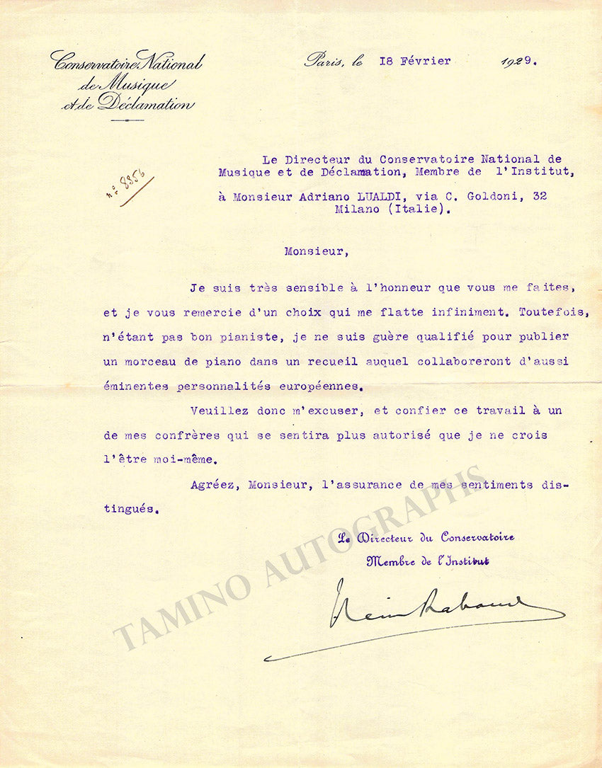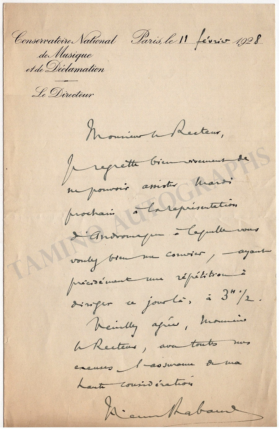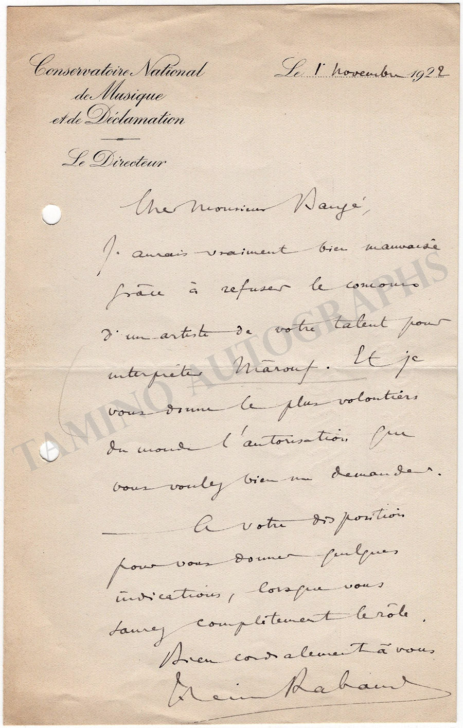 Autograph letter in French (untranslated) signed by him, dated 1929, with letterhead of the Conservatoire National de Musique et de Diclamation. Size is 4.9 x 8.4 inches, 1 written page, loss of paper over the upper-left corner, crack, otherwise in very good condition.