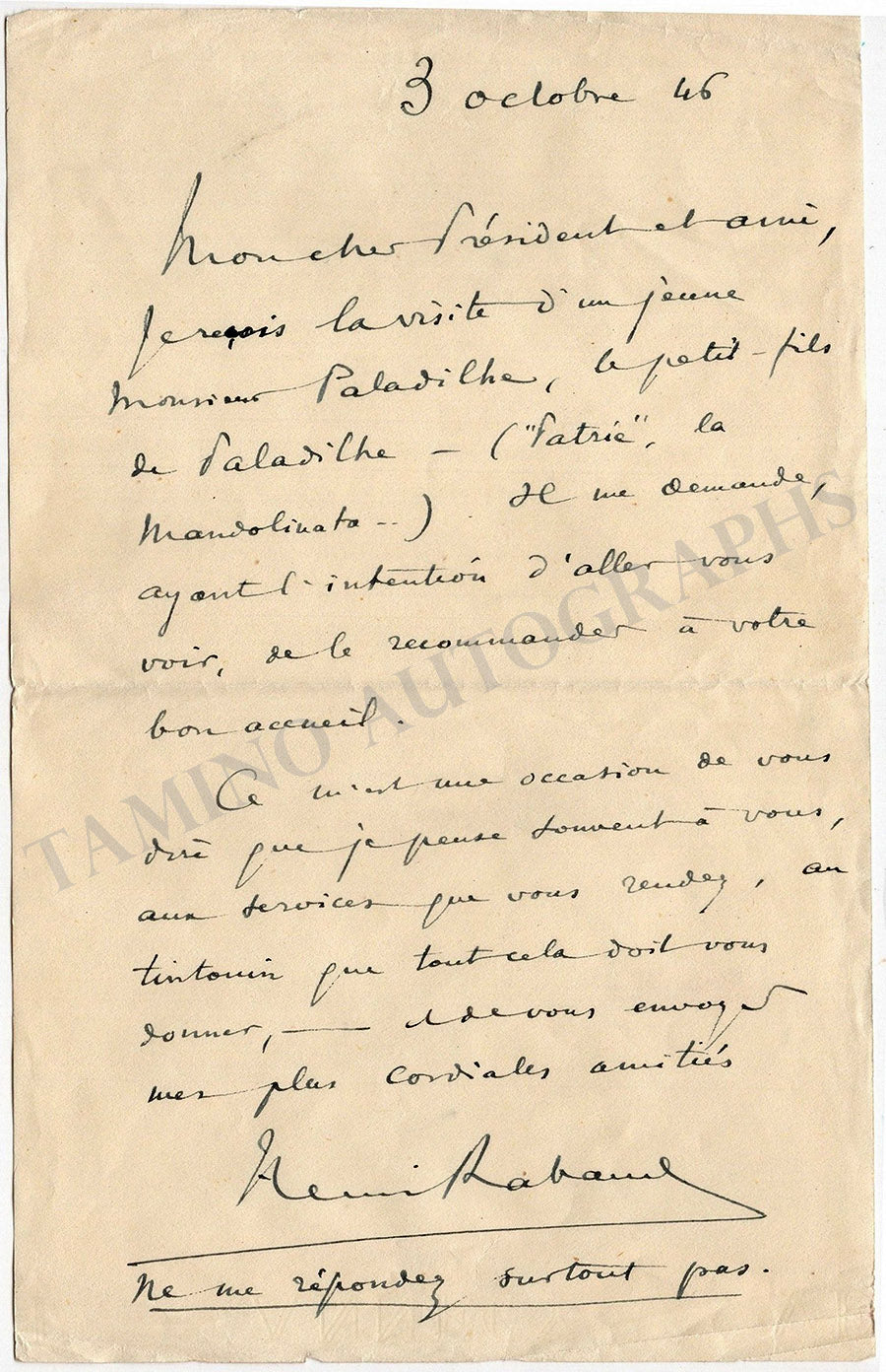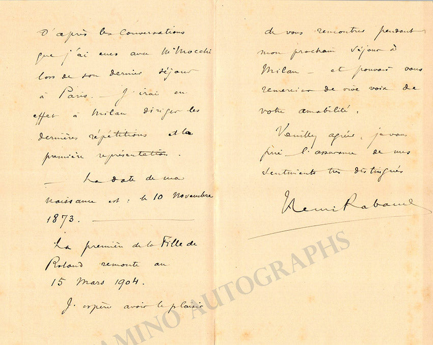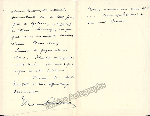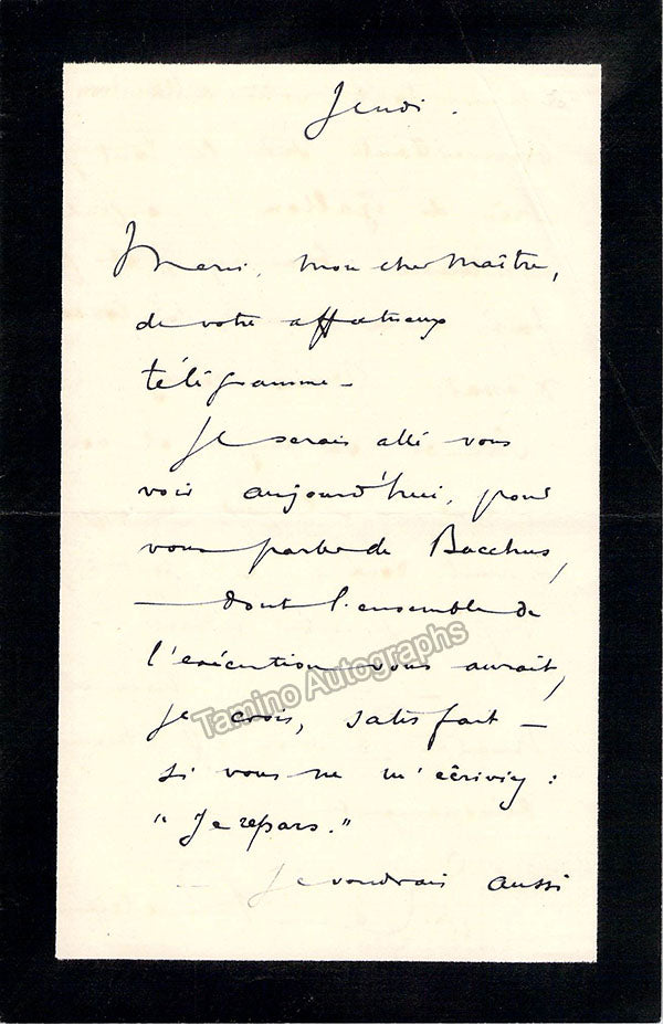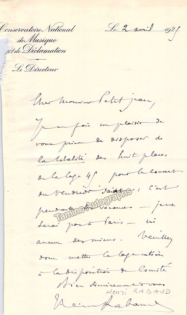 Autograph letter in French (untranslated) signed by him, dated 1929, with letterhead of the Conservatoire National de Musique et de Diclamation. Size is 4.9 x 8.4 inches, 1 written page, loss of paper over the upper-left corner, crack, otherwise in very good condition.