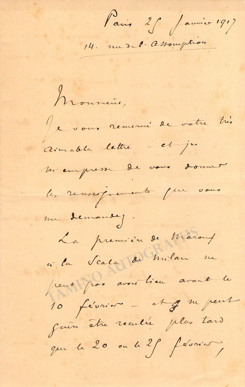 We report an extract of the letter to Baugé, concerning Rabaud’s opera Mârouf, savetier du Caire (1914): “…j’aurais vraiment bien mauvaise grâce à refuser le concours d’un artiste de votre talent pour interpréter Mârouf. Et je vous donne le plus volontiers du monde l’autorisation que vous voulez bien me demander…”.