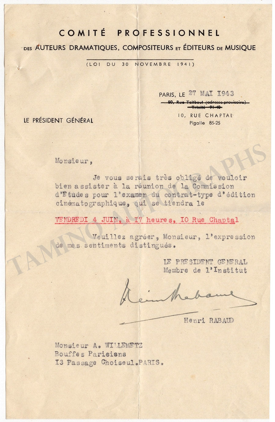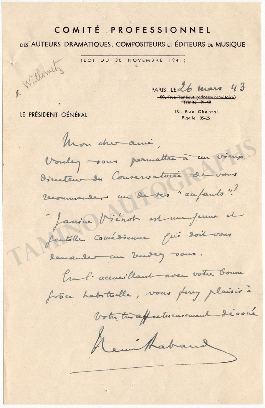 Lot of five autograph letters in French (untranslated) signed by him (one typed), dated between 1922 and 1946 by the French composer. Letters are addressed to several official figures, the typed letter is addressed to the librettist Albert Willemetz (1887-1964), to the baritone André Baugé (1893-1966), recommending pupils and other music matters.