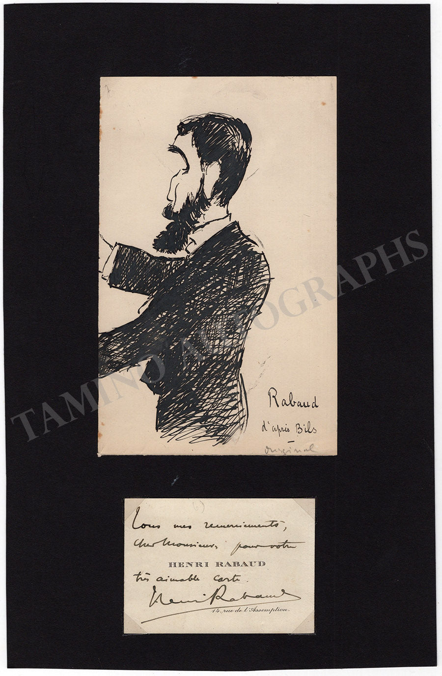 Beautiful autograph of Rabaud signed by the painter Claude Bils (1884-1968) mounted on black cardboard matted together with his visiting card with some autograph lines and Rabaud's signature. Total is 7.2 x 11 inches, in very good condition.