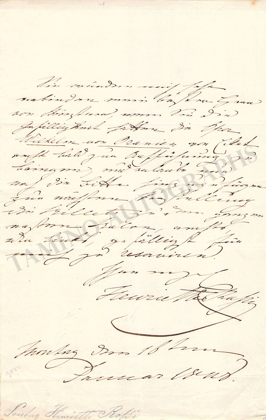 Autograph letter in German (sold untranslated) signed by her and dated in January 1848. Size is 5.1 x 8.25 inches, 1 written page, small rust stain spot over the upper-right corner, otherwise in excellent condition.