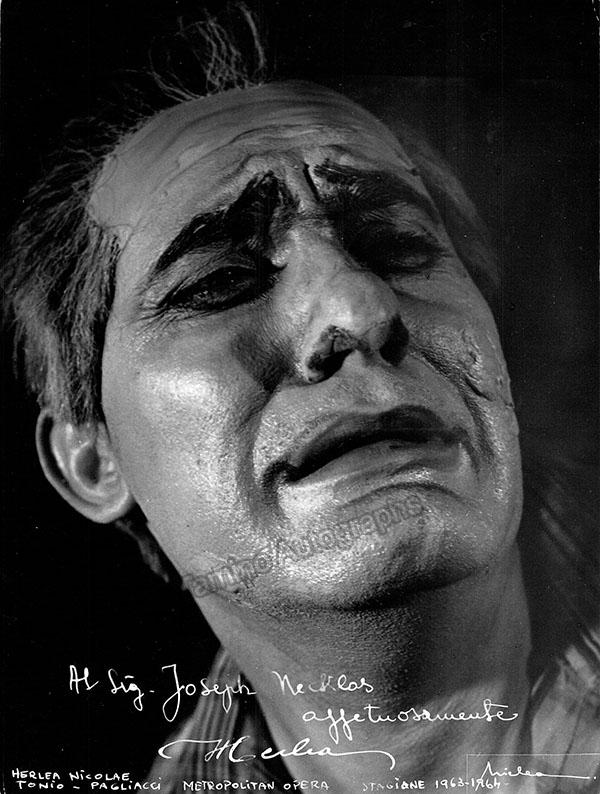 Romanian baritone (1927-2014), large signed photo, shown as Tonio in Leoncavallo's I Pagliacci, inscribed. Blind stamped on front and stamped on verso by photographer Ion Miclea. Size is 7 x 9.25 inches, in excellent condition.