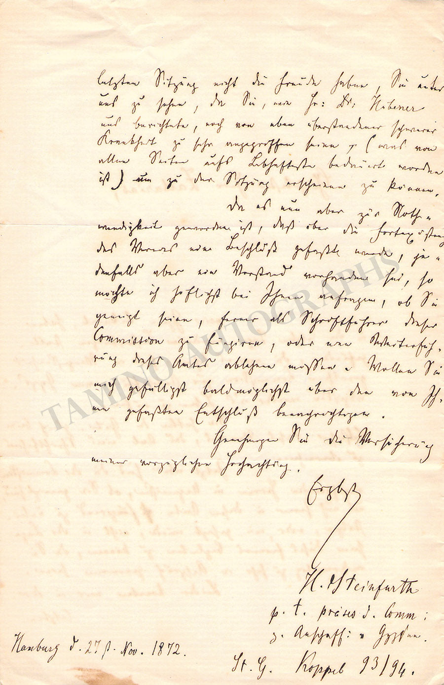 Autograph letter signed by him, written in German (sold untranslated), dated in Hamburg, 1872.  Size is 5.4 x 8.3 inches each page, 2 pages written on both sides of one sheet, folds, in excellent condition.