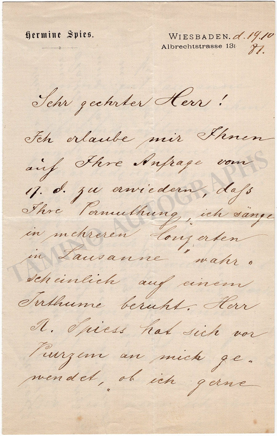 Spies, Hermine - Autograph Letter Signed 1887 Spies, Hermine - Autograph Letter Signed 1887