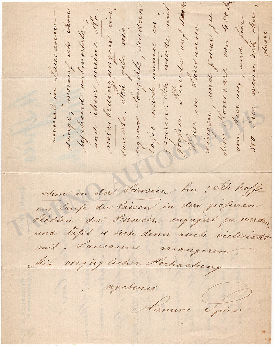 Autograph letter in German signed by her, dated in Wiesbaden October 19, 1887, addressed to a gentleman, concerning her fees for singing in Lausanne: