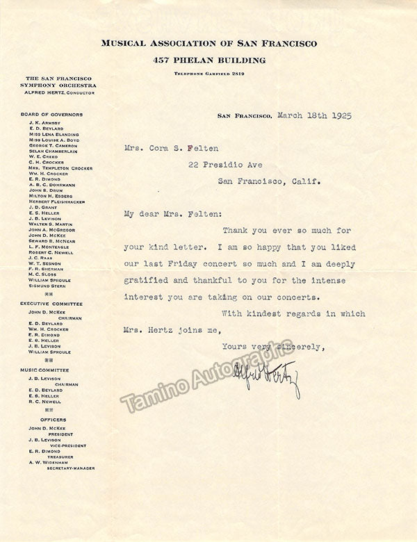 Typed letter signed, composed on letterhead of the Musical Association of San Francisco (San Francisco Symphony Orchestra), dated in San Francisco in 1925. Size is 8.5 x 11 inches, several small creases and folds, in very good condition.