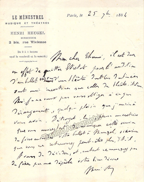 Autograph letter signed, written on personal letterhead, dated in Paris in 1884, 1 page, written in French and sold untranslated. Size is 4.25 x 5.25 inches, small creases, otherwise in very good condition.