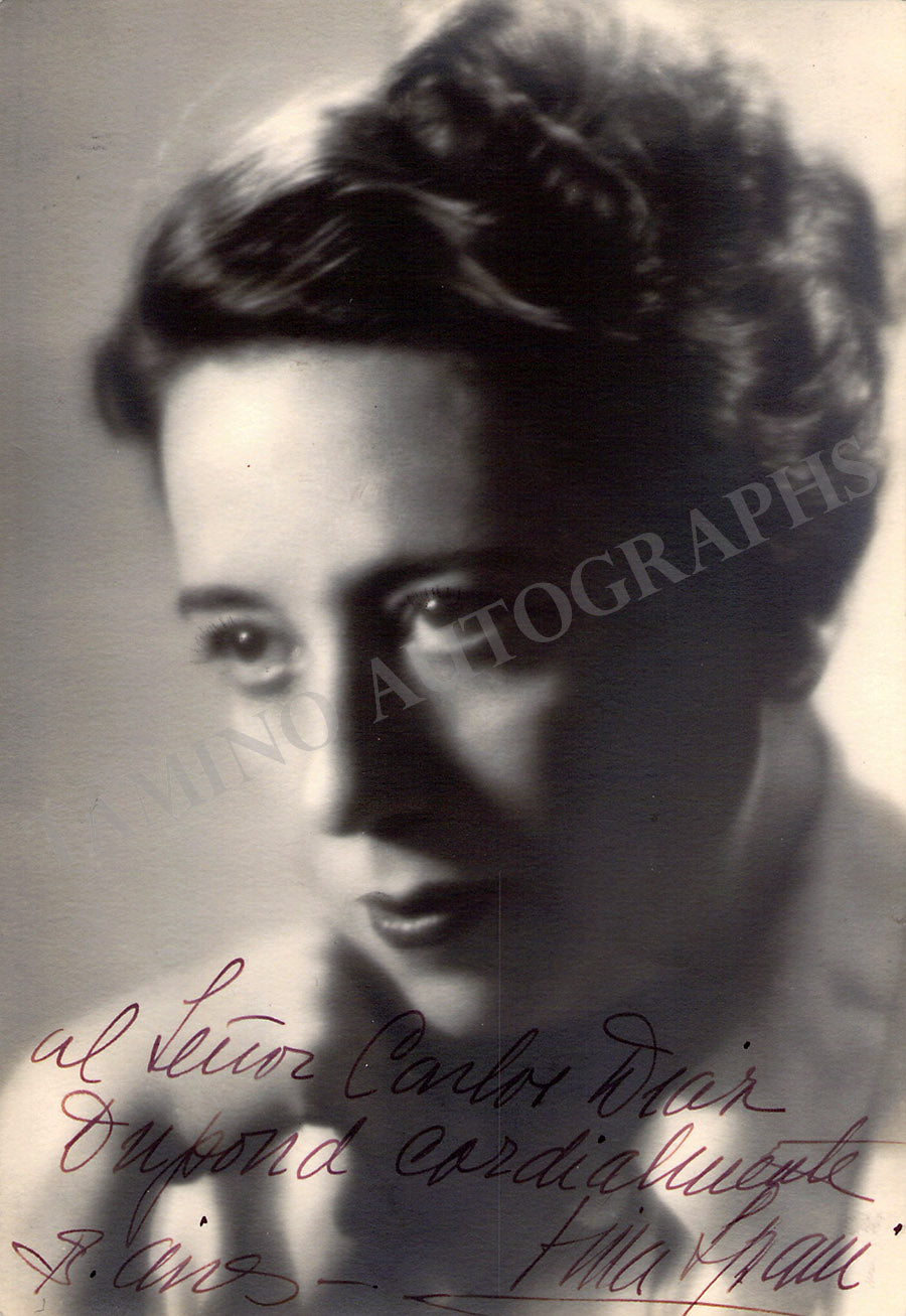 Beautiful black-and-white photograph inscribed and signed by her with a short sentiment in Buenos Aires. Size is 4.75 x 6.8 inches, in very good condition.