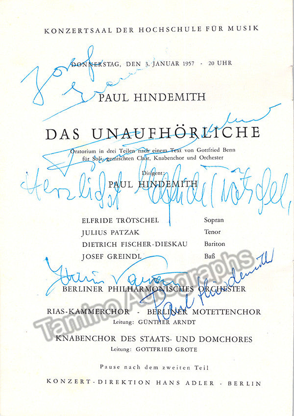 Nice program for a performance of the oratorio Das Unaufhörliche ("The Incessant"), with the creator of the piece Paul Hindemith as conductor. Performance at the Konzertsaal der Hochschule für Musik, Berlin, January 3rd, 1957.